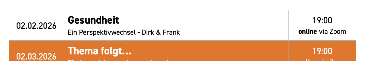 An jedem ersten Montag im Monat laden wir euch um 18 oder 19 Uhr zu interessanten Kurzvorträgen und Diskussionen rund um verschiedene Gesundheitsthemen ein. Die Teilnahme ist kostenlos - nutzt den Link rechts und schon seid ihr dabei!